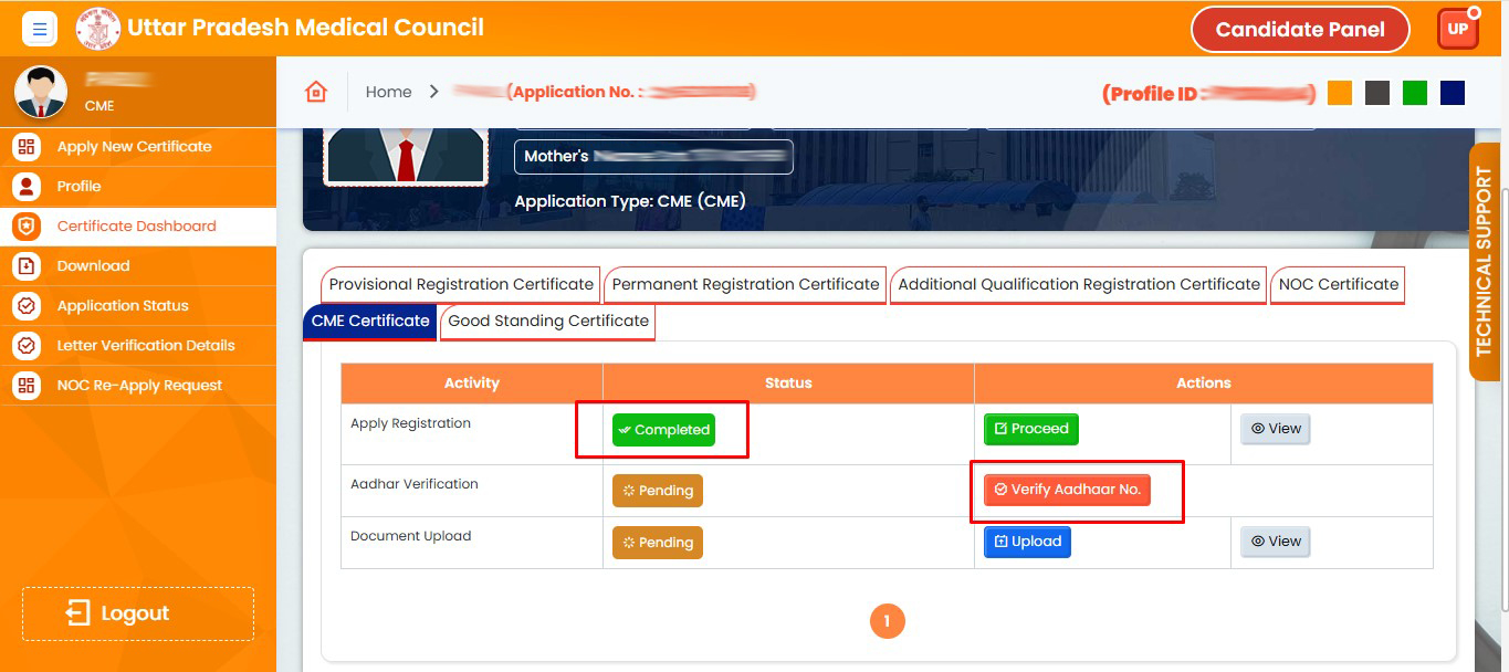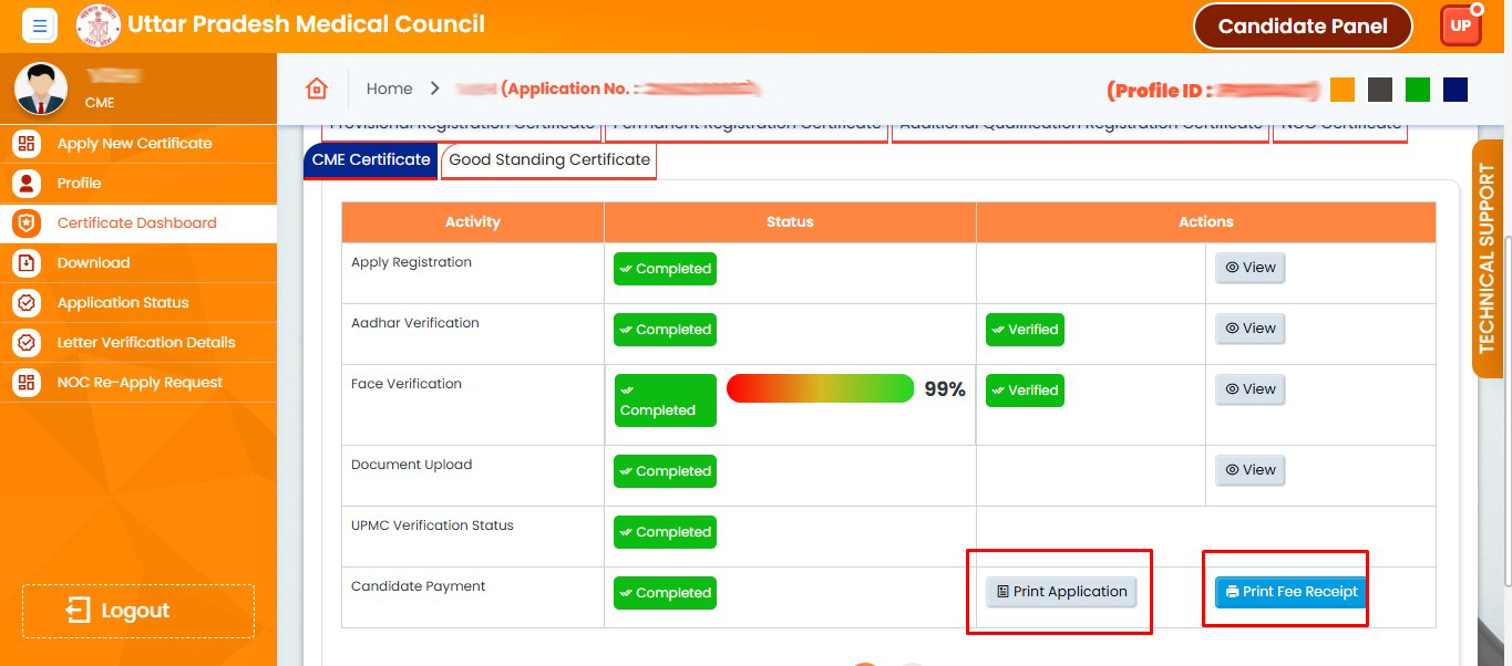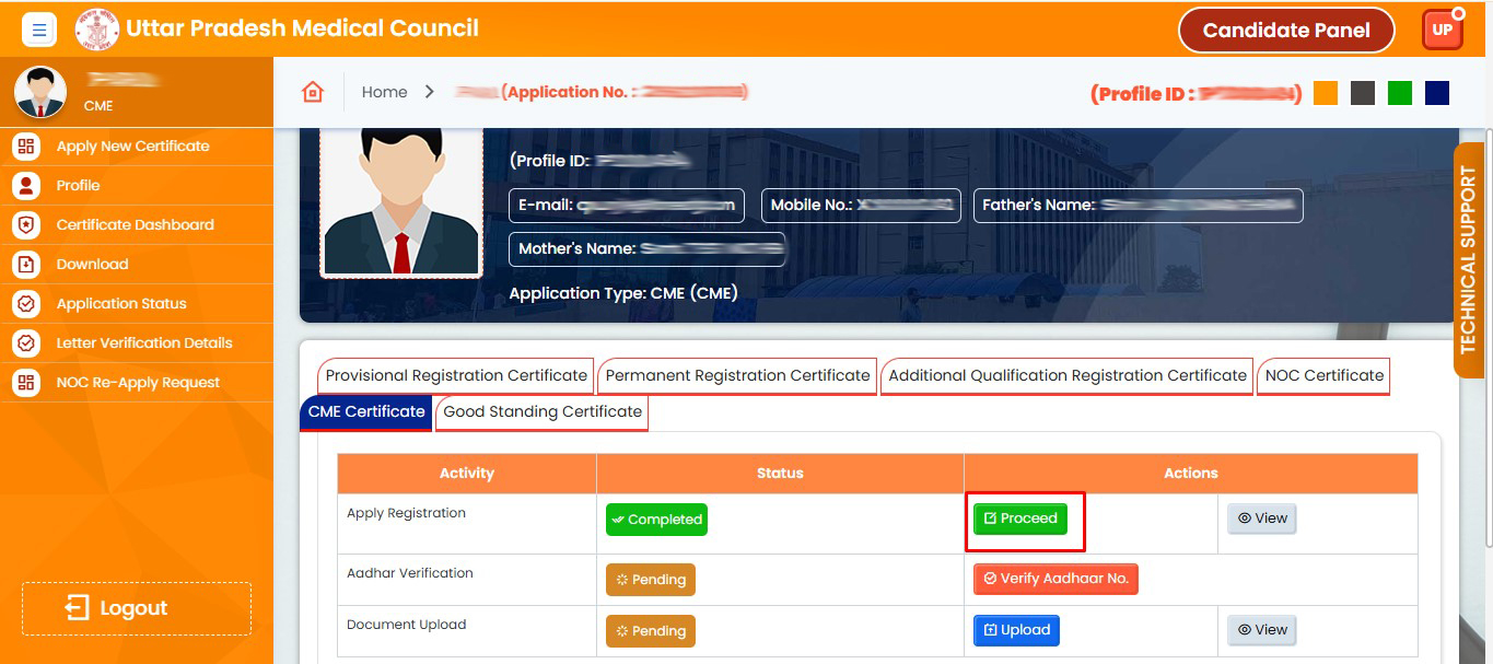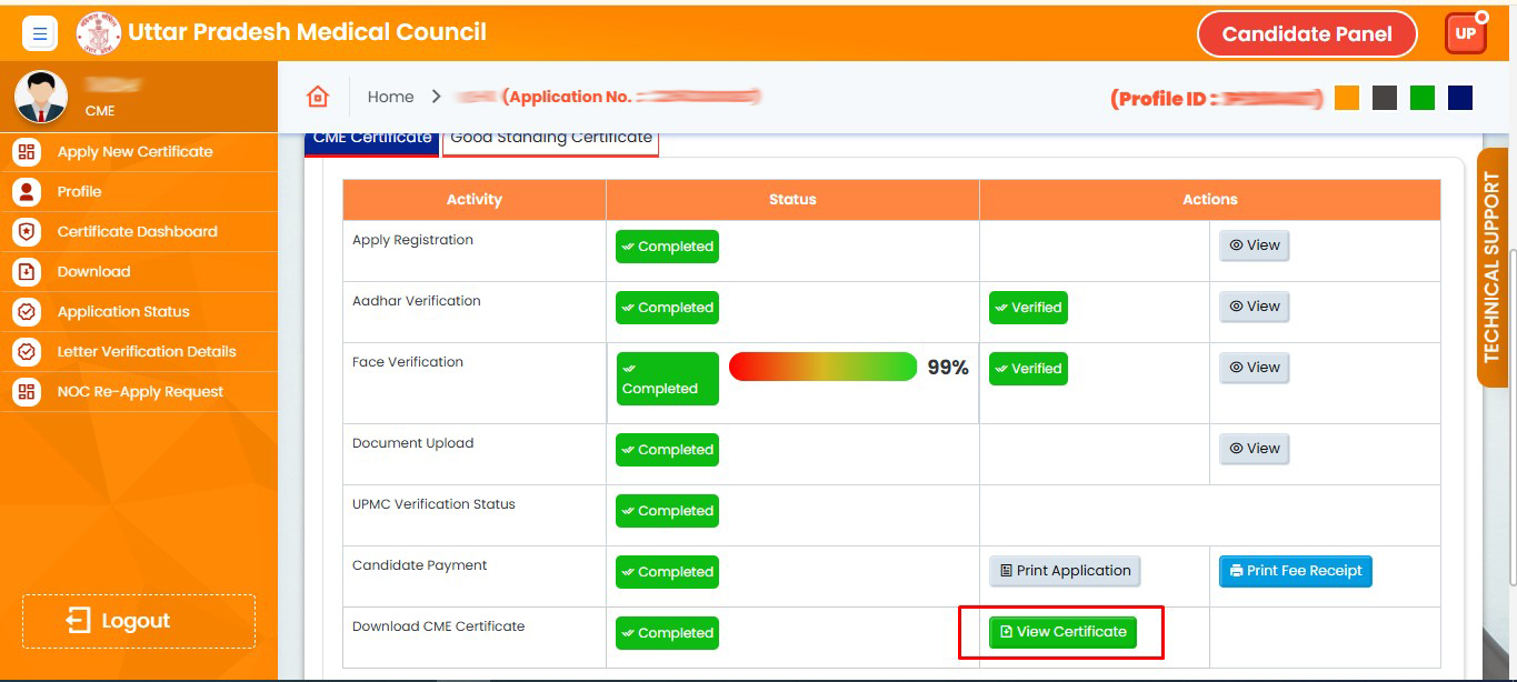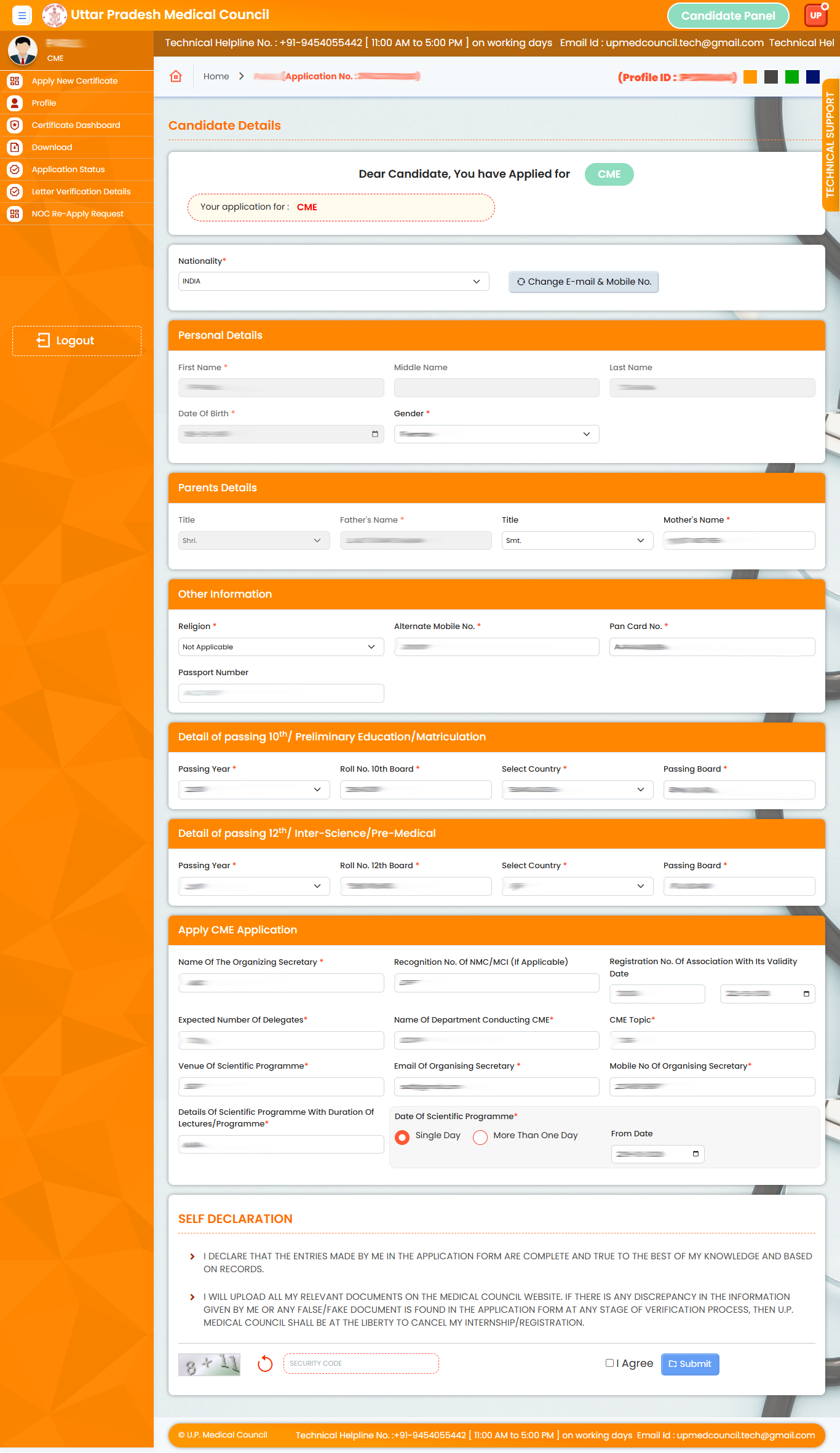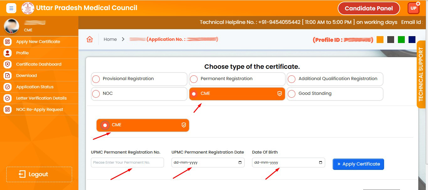 10. Select the CME option,Enter your Permanent Registration No,Registration Date and Date of Birth, and click Apply Certificate.