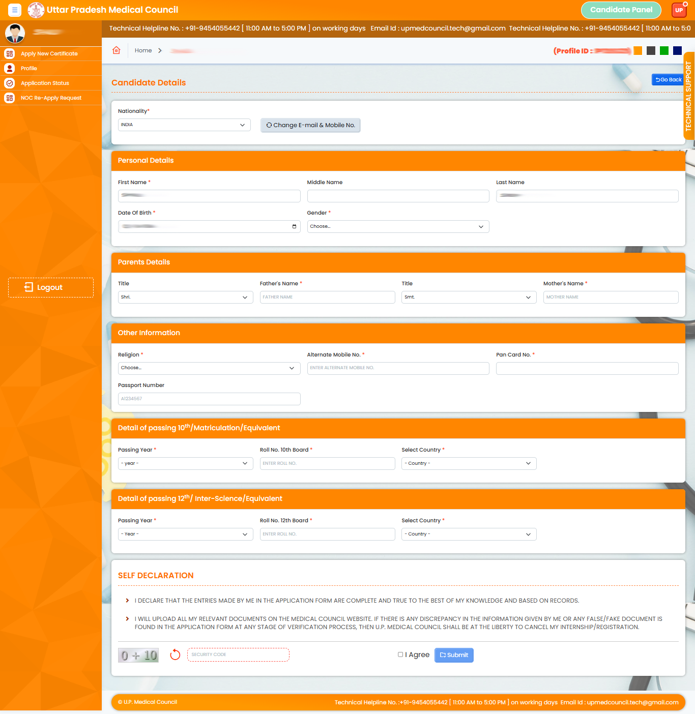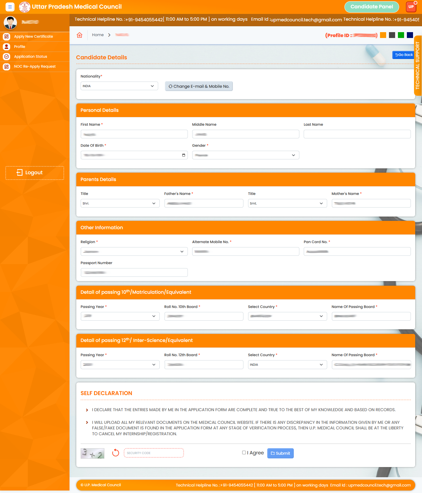 9. Enter all required student details, complete the captcha, tick the Self Declaration checkbox, and click Submit.