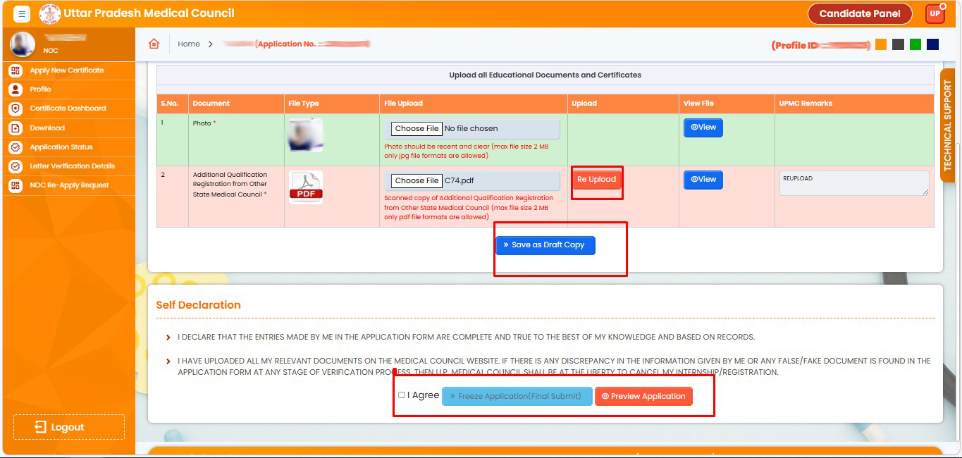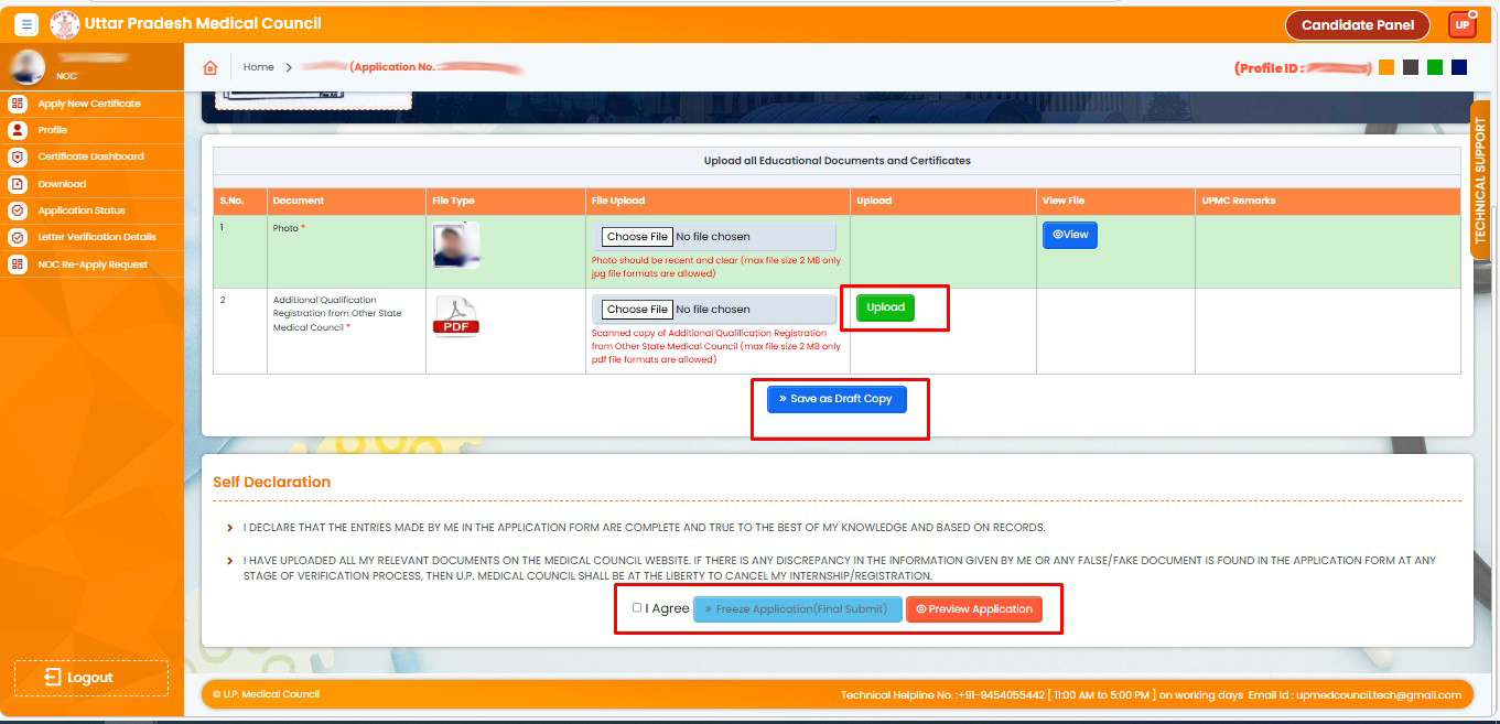 28. Now upload all your documents as per the given list. After saving the draft, you can Freeze Application (Final Submit) & Preview Application.