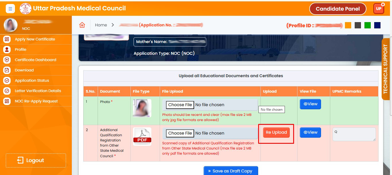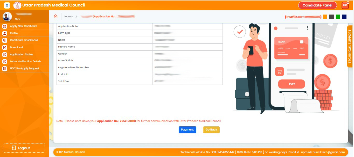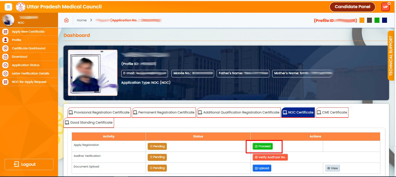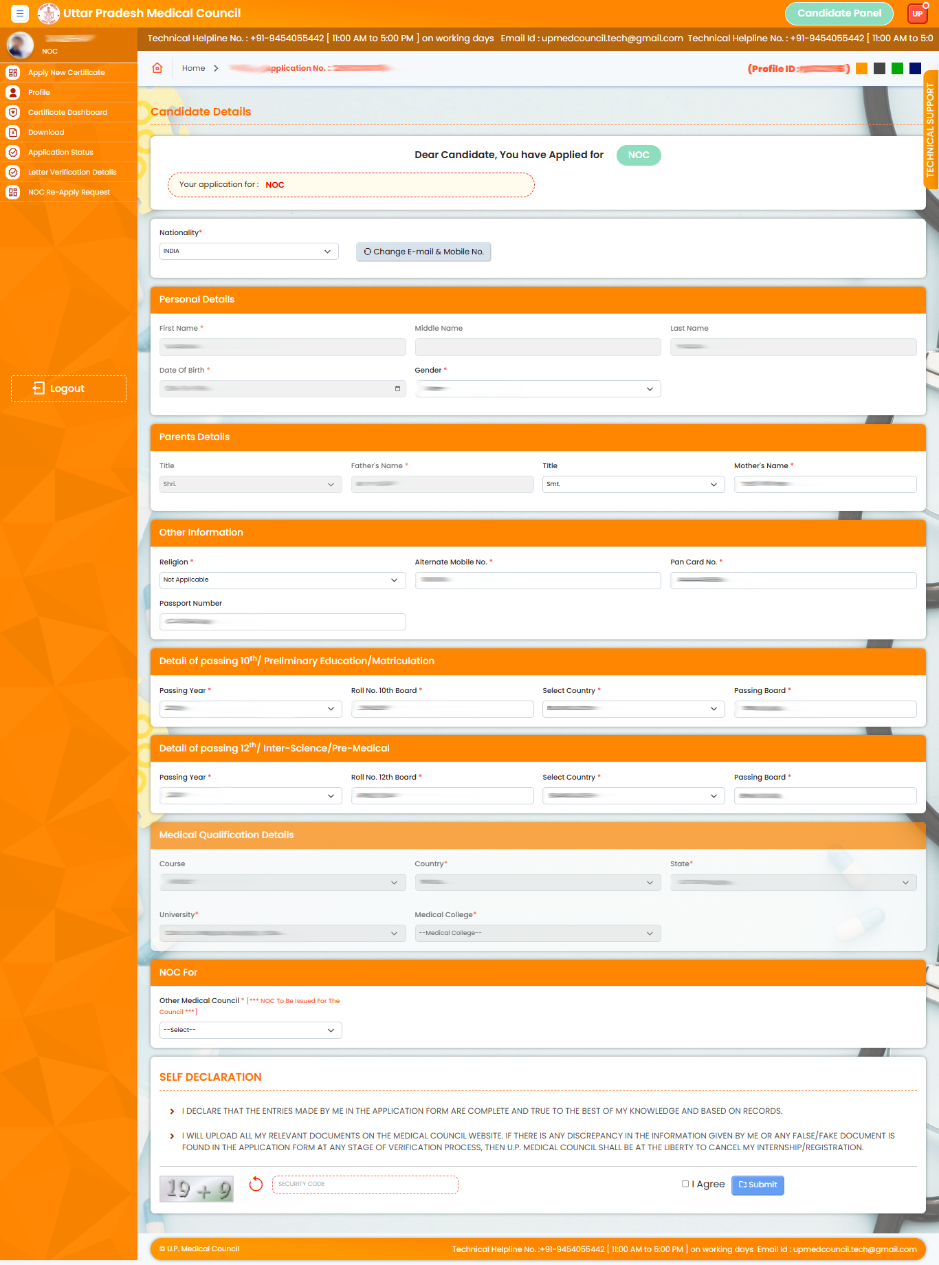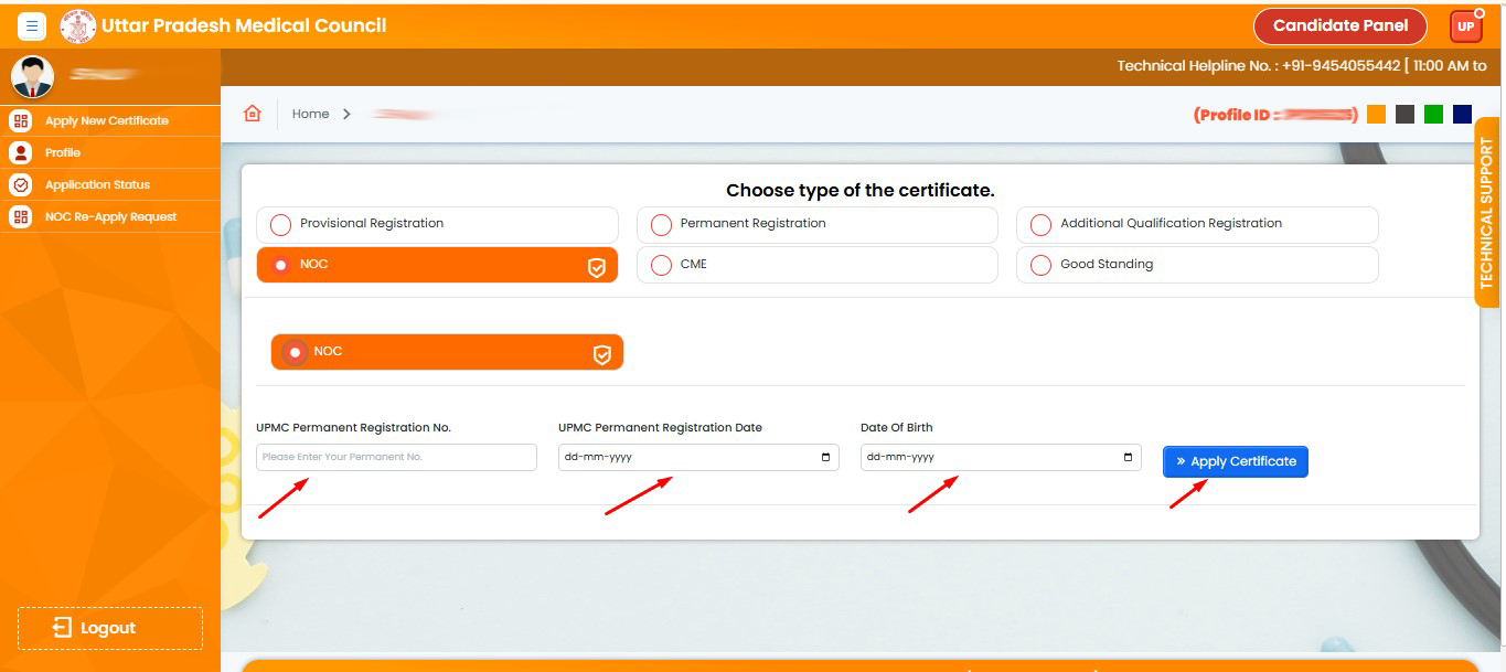 10. Select the NOC option,Enter your Permanent Registration No,Registration Date and Date of Birth, and click Apply Certificate.