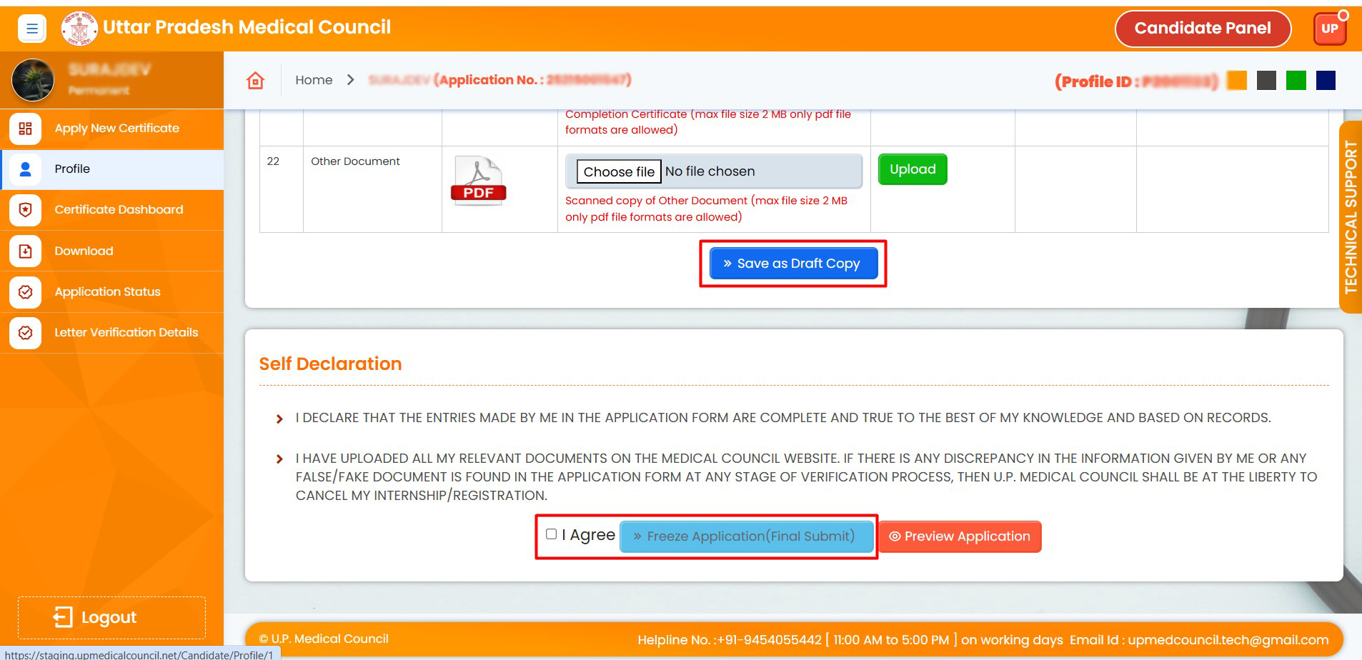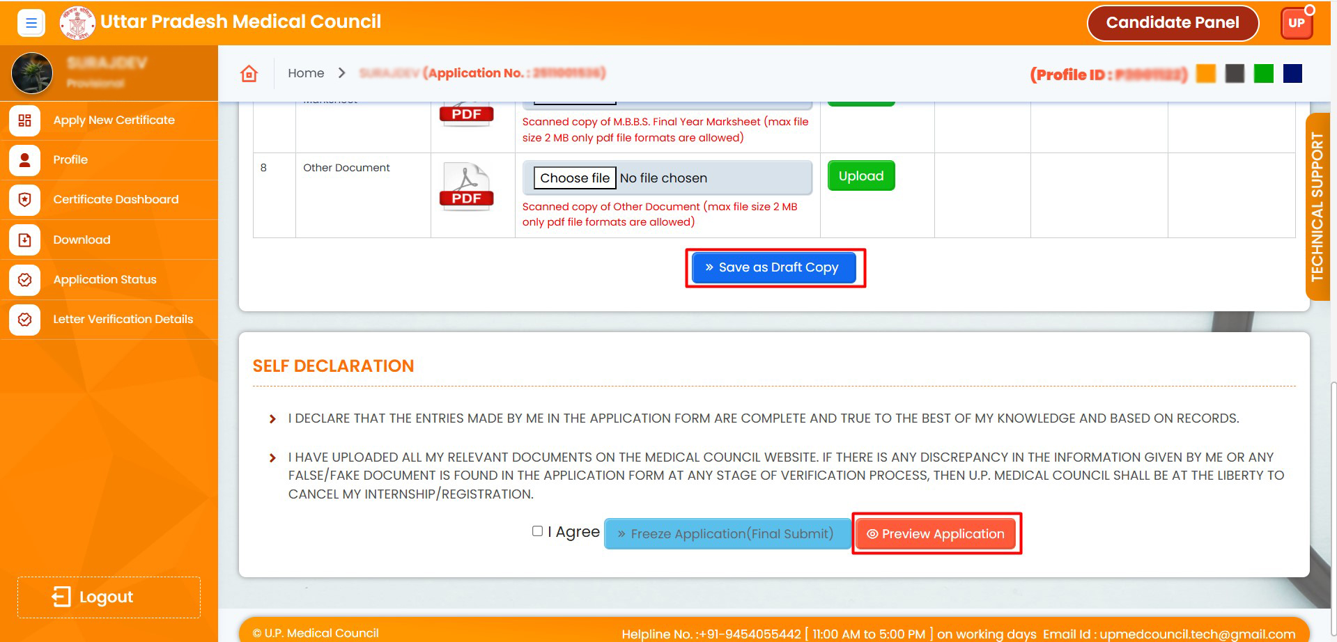 24. Upload all re-uploaded documents, click on "Save as Draft", and then agree to finalize (freeze) the application