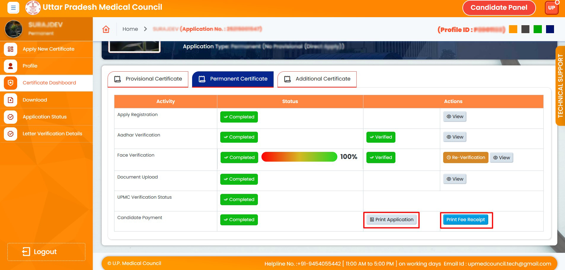 26. Click on "Print Application" to print your application. Click on "Print Fee Receipt" to print your fee receipt.