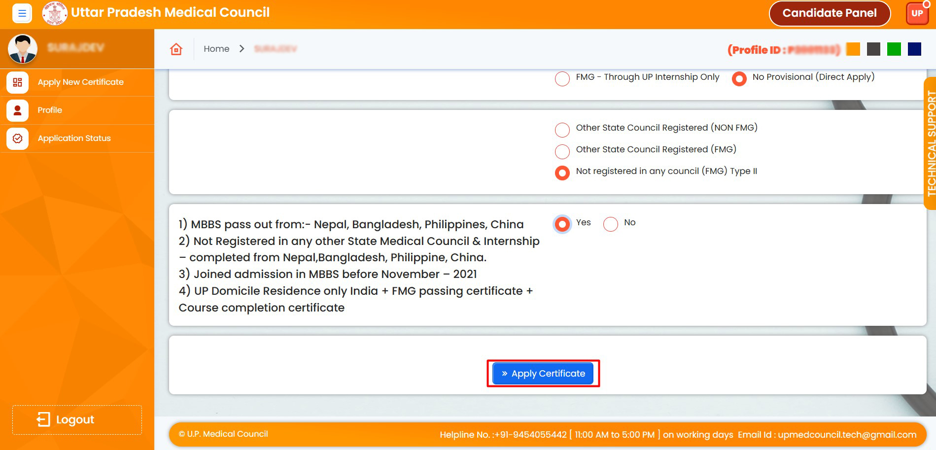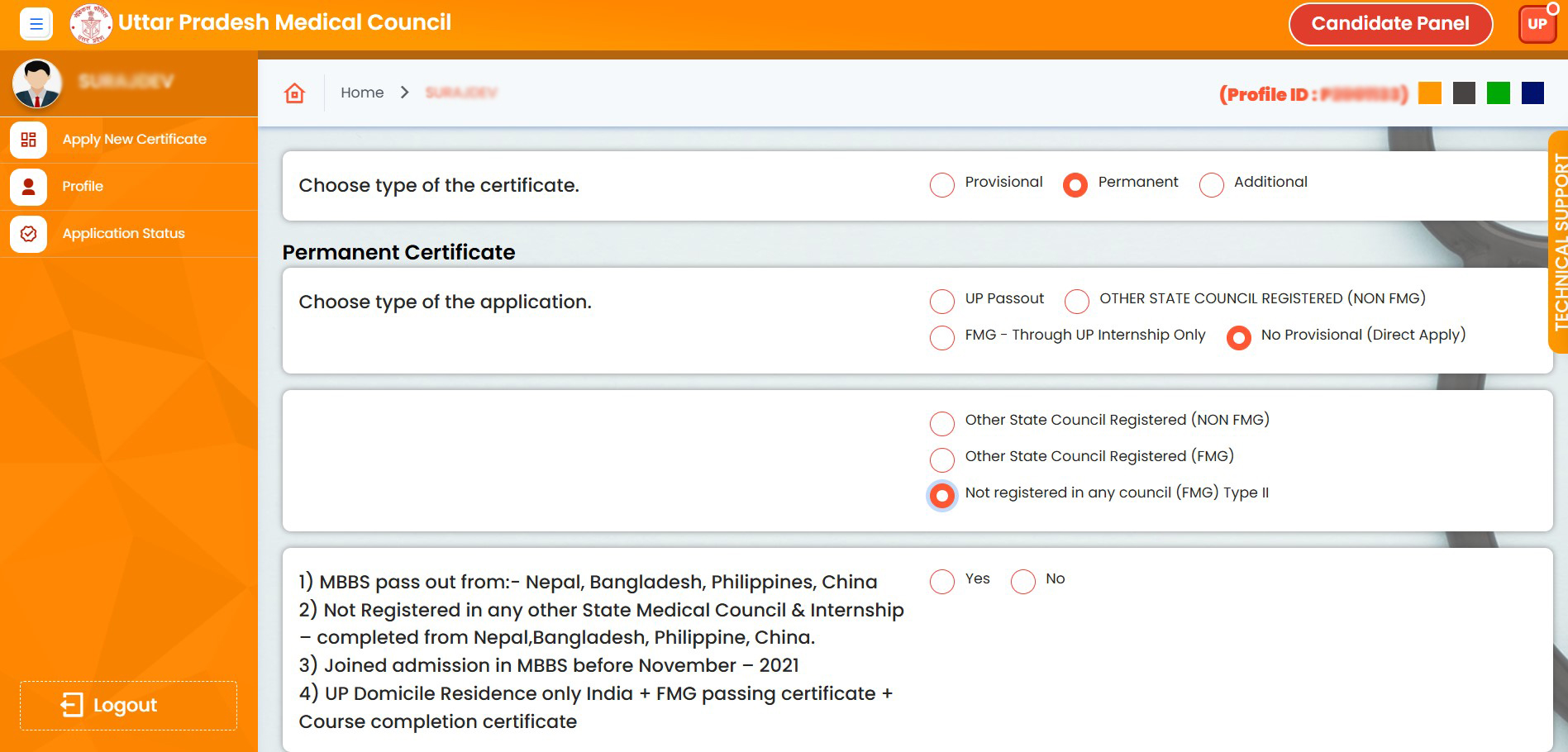 8. First, click on the "Permanent" radio button, then select the "No Provisional (Direct Apply)" radio button, and finally click on the "Not Registered in Any Council (FMG) Type-II" radio button.